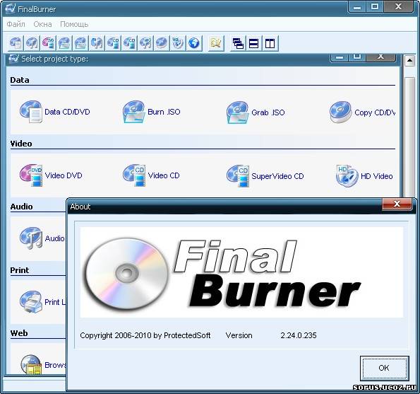 FinalBurner PRO - профессиональная версия пакета программ для записи CD, DVD и Blu-Ray дисков с различными данными, музыкой и видео. С помощью данной программы вы с легкостью сможете записать диск с данными, создать CD-аудио и DVD-видео диски, а также сделать ISO-образ диска. Также Вы можете использовать FinalBurner PRO для создания профессиональных обложек для Ваших дисков. Для записи CD-аудио подходят многие музыкальные форматы, которые свободно импортируются при добавлении их в проект. Не менее полезной возможностью является импортирование множества видео файлов для создания своих DVD-видео дисков. Поддерживается работа со всеми распространенными типами носителей, включая двусторонние DVD и Blu-Ray диски.